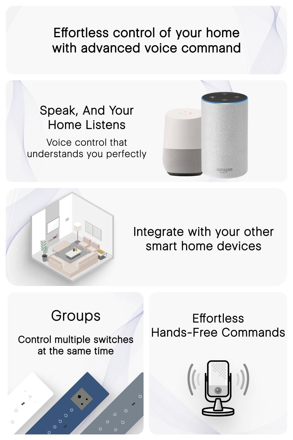 Switch can be controlled by voice commands using Alexa or Google Home or any Android device. Routines and groups can be created so multiple devices are turned on or off based on the specific requirements.