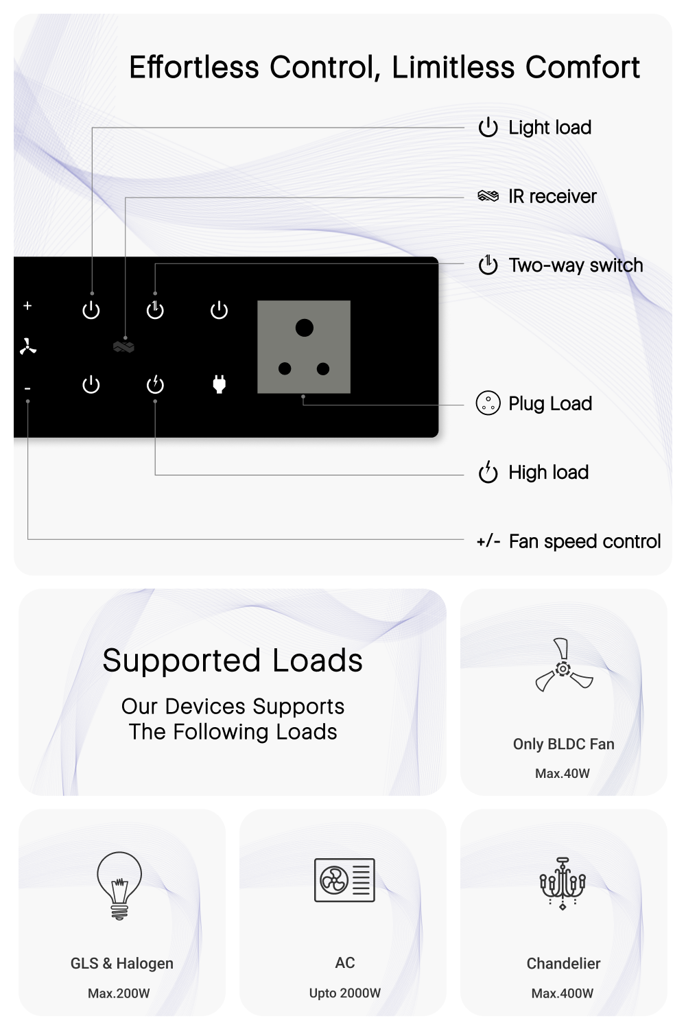 IR Remote Control for maximum convenience to operate the connected devices. Easy pairing & long range - upto 22 feet allows you to remotely control individual switches or turn on / off all devices at once.